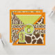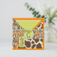 Impressions de Safari, girafe, zèbre, guépard et motif à pois de polka, avec un singe accroché sur une vigne et des étiquettes d'apparence 3D, arcs, garnit la carte d'invitation d'anniversaire pour un enfant de trois ans.