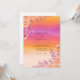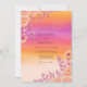 This design showcases a vibrant watercolor gradient transitioning from warm orange to deep magenta. Delicate peach roses and pink daisies are paired with purple eucalyptus leaves in a graceful arrangement. The bold ombre background creates a romantic atmosphere reminiscent of a tropical summer sunset.