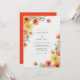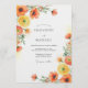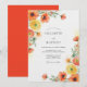 This design features a vibrant cascade of poppies and ranunculus in warm orange, sunny yellow, and soft coral hues. Delicate greenery intertwines with the blossoms, creating a lively and romantic impression. The artwork evokes a feeling of joyful abundance and natural beauty for a special occasion.
