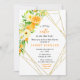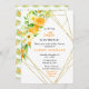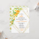 This fun and whimsical baby shower invitation features watercolor oranges, daisies and foliage on a gold geometric frame. The text combines handwritten script and serif fonts for a stylish and modern look. This is perfect for a summer rustic baby shower.