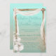 Ce faire-part de mariage a pour thème la plage romantique. L'arrière - plan bénéficie d'un dégradé qui ressemble à une plage ou une île tropicale de l'océan. Au centre se trouve une arche boho en bois et en mousselon. Une grande tige d'orchidées blanches de style aquarelle est placée sur la gauche.