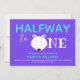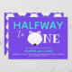 Une invitation à la fête d'anniversaire avec un thème d'ours polaire en violet, turquoise et blanc. Il présente un visage d'ours mignon comme la première lettre du mot "Un". Customisez simplement cet invitation, ajoutez-le à votre panier et profitez de la fête des six premiers mois de votre bébé!