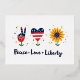 Invitez vos invités avec positivité et style patriotique ! 🎉🕊️ Cette invitation présente une illustration adorable du signe de la main de la paix, du cœur et du tournesol — chacun décoré de motifs créatifs rouges, blancs et bleus. En dessous, un texte ludique dit “Paix • Amour • Liberté” avec des étoiles éparpillées. Parfait pour les barbecues dans la cour, les défilés, les fêtes de famille ou les événements du 4 juillet pour les enfants ! 🇫🇷🎆