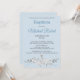 Celebrate your child’s special day with this elegant blue and white watercolor baptism invitation. White flowers rest atop gray tone foliage, with a hand-painted brown cross above the flowers on a pale, blue background, creating a serene and graceful design.
