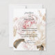 Ce design présente une étonnante palette de couleurs, avec un agencement abondant de roses doux rose, taupe et crème aux côtés des pivoines. Il est mis en valeur par un ruban foncé contrastant, créant une invitation florale qui attend votre touche personnelle pour votre jour de mariage.