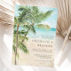 Cette invitation à la plage tropicale moderne est parfaite pour les mariages de destination, ou tout mariage à thème côtier. Une scène de plage couleur aquarelle se trouve dans l'arrière - plan, avec des palmiers encadrant le texte.