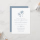 Cette simple invitation de mariage à la plage tropicale bleu poussiéreux simple comprend deux palmiers avec les initiales monogrammes de la mariée et du marié en haut. en haut.