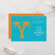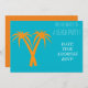 Une invitation à la fête pour une fête sur la plage avec une hanche rétro, graphique cool de palmiers colorés orange vif à l'ambiance hawaiienne, aux couleurs vives de l'orange et du bleu de l'océan. Le texte de cette invitation est entièrement personnalisable pour inclure vos propres informations personnelles.