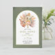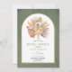 Feuilles de palmiers séchés tropicaux, pampas herbe et protéa fleurs vert arche mariage invitation à la douche nuptiale. Ce joli design mariage dispose d'un cadre en arc sur arrière - plan teinté vert. Dans le cadre il y a un bouquet d'aquarelle de feuilles de palmiers séchés, des fleurs de protéa et de l'herbe de pampas.
