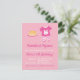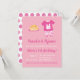 Invitation vos enfants dans leur meilleur pyjama pour une fête d'anniversaire avec pancakes et pyjamas ! Cette invitation comprend une assiette de crêpes et une paire de pyjamas de tee lapin et de pantalon pois. Palette de couleurs en grande partie rose et blanc.