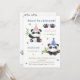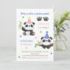 Cute baby panda kids birthday invitation featuring two adorable panda wearing party hat with a panda footprint and surrounded by stars.