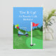 Célébrez l'anniversaire de votre enfant ou toute étape importante avec cette illustration originale de Daphsam. L'invitation présente une voiturette de golf bleue avec un gâteau d'anniversaire au thème du golf sur le siège et des ballons attachés aux clubs de golf.