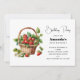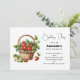 Une invitation à l'anniversaire avec une jolie illustration montrant des fraises fraîchement cueillies remplissant un pittoresque panier en osier.