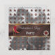 Une élégante invitation en feuille de cuivre et d'argent avec une lune rouge ornée d'un charme de perle rubis or, de colliers de cœurs rubis or et d'étoiles cuivrées brillantes.