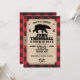Un fond de plaid bison rouge contraste avec un panneau aspect papier kraft maintenu par une sangle en jute sur cette invitation sur le thème des Northwoods. Le panneau contient les informations de la fête avec un ours entre deux pins. La hache croisée crée un logo personnalisé en dessous. Idéal pour un anniversaire, une soirée d'enterrement de vie de garçon, un événement saisonnier ou une célébration sur le thème du plaid bison ou du bûcheron. Disponible avec des produits assortis.