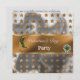Une élégante invitation orange et argentée à paillettes présentant une lune verte khaki avec un charme d'émeraude perlé or, des colliers de coeurs d'émeraude or et des étoiles orange foncé brillantes.