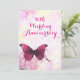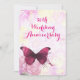 Une invitation d'anniversaire de mariage élégante et sophistiquée. Le design de l'invitation est un beau papillon peint de violet. Sur un fond délicat qui a une texture aquarelle unique et créative avec des fleurs fanées roses et jaunes romantiques. Avec un logo antique faiblement visible en bas pour lui donner un certain charme vintage