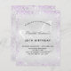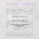 Une invitation d'anniversaire moderne, élégante et minimaliste. Arrière - plan métallique argenté Faux décoré de poussière de parties scintillant violet et un butterlfy comme filigrane. Personnalisez et ajoutez vos noms et les détails du mariage. Lettres de couleur noire.