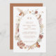 La conception moderne et romantique de cette invitation de mariage aux fleurs sauvages bohèmes a été peinte à l'aquarelle par l'artiste et designer licenciée internationale Audrey Jeanne Roberts. Des fleurs sauvages séchées aux couleurs chaudes et atténuées se fondent magnifiquement dans l'arrière-plan de terre cuite rouillée et sont disposées dans un cadre ovale lâche avec des illustrations linéaires et une paire de papillons délicats et de feuillage de feuilles de Ginkgo. Cette version présente un devant blanc léger et aéré avec un texte et un fond terracotta au verso. Tous droits réservés.