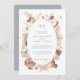 La conception moderne et romantique de cette invitation de mariage aux fleurs sauvages bohèmes a été peinte à la main à l'aquarelle par l'artiste et designer licenciée à l'international, Audrey Jeanne Roberts. Des fleurs sauvages séchées aux couleurs chaudes et atténuées contrastent magnifiquement avec le gris-bleu poussiéreux et froid et sont disposées dans un cadre ovale lâche avec des illustrations linéaires et une paire de papillons délicats et de feuillage de feuilles de Ginkgo. Cette version présente un devant blanc léger et aéré avec un texte bleu ardoise moyen et un fond sur le verso. Tous droits réservés.