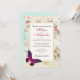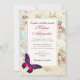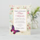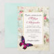 Une belle invitation de mariage avec un élégant papillon magenta rose aux accents violets. Un cadre blanc avec une bordure dorée est superposé à un collage vintage défraîchi avec des roses roses et d'autres éléments décoratifs. Une ambiance chic et démodée.