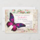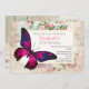 Une invitation de fête d'anniversaire de 50e (ou autre âge). Conçu avec un élégant papillon rose aux accents violets. Un cadre crème avec une bordure dorée. L'arrière - plan est un motif de collage vintage avec des roses et un look vieillot et désuet.