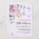 Un arrière - plan doux couleur lilas. Décoré d'un rose lilas et violet et d'une verdure d'eucalyptus vert couleur eau et de papillons. Personnalisez et ajoutez votre nom et les détails de votre fête.
