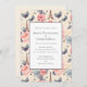 Faire-part de mariage avec une élégante motif. Roses roses, papillons gris-bleu et tour Eiffel. Une motif à thème française.
