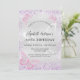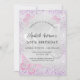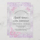 Une invitation d'anniversaire moderne et élégante. Fond de couleur argent faux décoré de paillettes violettes, papillons roses et un papillon argent en filigrane. Personnalisez et ajoutez vos noms et détails de mariage. Lettres de couleur noire.