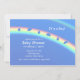 Une invitation baby shower avec parapluie et tombe sur un arc-en-ciel sur un arrière - plan bleu. Un exemple de texte personnalisable est prêt à être édité avec vos propres détails.