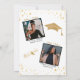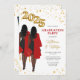 Invitation du parti afro-américain de double diplôme. Les jumelles jumelles double graduation combinent fête de remise des diplômes. Portrait de femmes jumelles aux cheveux longs foncés en robes noires avec robes de graduation rouges et casquettes de graduation avec ballons d'or pour la classe de 2025. Les deux jumeaux sont au dos de la carte avec leurs photos, noms, écoles et diplômes.