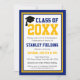 Cette invitation de la Marine et de la Gold Photo Graduation Party est une excellente façon de célébrer le baccalauréat ou diplôme collégial. Personnalisez ceci avec le nom, l'école, l'année, les détails de la fête et la photo du diplômé au dos. Cet invitation présente une typographie audacieuse dans les couleurs de la marine et de l'école d'or avec une bordure marine et or.