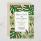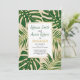 Monstère tropicale verte et dorée et palmier feuille beige invitation de fiançailles. Il présente un motif de feuilles tropicaux avec contour doré sur beige et votre texte dans un cadre blanc. L'arrière comprend un motif à points de polka doré.