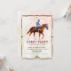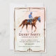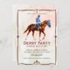 Invitation de la course de cheval moderne Derby Party avec une illustration d'un cheval de course avec jockey et motif rayé sur le dos. Tous les éléments de texte peuvent être changés afin que ce design puisse être utilisé pour d'autres événements aussi : faire-part de mariage équestre classe, fête d'anniversaire de cheval, fête de montre de derby, ouverture de grange de cheval et plus encore. Arrière - plan, la couleur de l'illustration et les couleurs du texte peuvent être changés à l'aide de l'outil de conception!