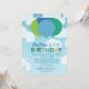 Colorful round balloons in a bouquet arrangement and a bright blue summer sky decorate these stylish birthday party invitations. Designed for a boy's birthday, the colors include vibrant shades of blue, green, and yellow.