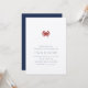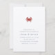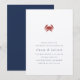 Venez fêter votre amour avec nos élégantes invitations à des soirées d'été, avec un style nautique classique avec un look épuré et minimaliste et une touche légère de vie marine. Le design comporte une petite illustration de crabe en rouge en haut, avec un élégant bloc et des lettres en italique en bleu marine complète le look. Parfait pour les fêtes nautiques, estivales ou en bord de mer, surtout si le crabe est au menu !