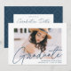 Invités Invitations pour célébrer la remise des diplômes avec nos invitations modernes de la fête de remise des diplômes photo. Les invitations branchés de la fête de remise des diplômes présentent la photo du diplômé avec "Graduate" dans une superposition de script de calligraphie moderne de la Marine. Personnalisez le devant des invitations en ajoutant le nom du diplômé, le nom de l'école et l'année de fin d'études. L'invitation s'inverse pour afficher les détails de votre fête de remise de diplômes et un motif géométrique à pois blanc et marine tendance.