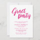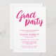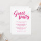 Ce design d'invitation rayonne de sophistication et de simplicité avec une esthétique minimaliste moderne. La palette de couleurs est strictement rose et blanc, assurant un look élégant et intemporel. Les mots "Grad Party" occupent le devant de la scène, écrits dans un script de brosse accrocheur qui ajoute une touche ludique et chic à la disposition. En-dessous, des polices sans serif propres et propres affichent gracieusement les détails de l'événement de manière structurée et organisée.