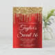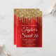 Créez votre propre invitation à célébrer le 16e anniversaire pour votre fille. La parties scintillant décorative en or brillant éclaire les graphiques d'une bordure supérieure. L'art numérique arrière - plan présente une feuille en métal brossé brillant de style rouge foncé. Customisez la couleur de texte ou les styles de police blancs de l'invitation. Le texte "Sweet 16" est également personnalisable. Les scintillants de luxe, la parties scintillant et la feuille seront créés avec des éléments artistiques qui s'impriment comme une photo.