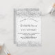 Une invitation à une soirée d'anniversaire élégante du 21ème (ou de tout âge). Un arrière - plan blanc chic à l'avant. Décoré avec de la parties scintillant en faux argent. Personnalisez et ajoutez un nom et des détails du parti. Le nom est écrit avec un script de style écrit à la main. Dos : arrière - plan faux argenté avec étincelles.