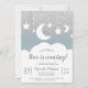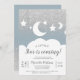 Une petite étoile arrive ! Célébrez votre baby shower avec cette jolie parties scintillant argentée qui brille sur le bleu poussiéreux, les lunes et les nuages avec une élégante typographie moderne.