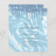 Un design chic et moderne avec une soie bleue pâle ou un arrière - plan satiné avec une bordure supérieure de parties scintillant bleue gouttes. Les mots "douche nuptiale" et le nom de la future mariée apparaissent dans un script de calligraphie en minuscules avec des swashes décoratifs au début et à la fin, avec le texte restant dans la police sans serif. L'arrière - plan satiné bleu et la bordure de goutte de parties scintillant sont répétés à l'envers. (Pour garder les swashes, ne remplacer que les lettres du nom de la future mariée, laissant les symboles en place.)