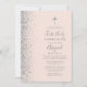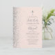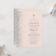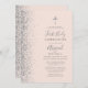 Le bord gauche de cette élégante invitation de première communion moderne comporte une bordure en faux parties scintillant argenté. Une fausse croix de feuille argent apparaît au-dessus du texte personnalisable, qui combine écriture manuscrite, copperplate et polices italiques en blanc sur un arrière - plan noir. L'envers présente un design noir et argent assorti.