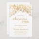 75e Invitation à la fête d'anniversaire Surprise pour les femmes avec des lampes à cordes dorées scintillantes et un bokeh pétillant sur un arrière - plan blanc. Parce que le texte est personnalisable, cette invitation est conçue pour une femme qui célèbre n'importe quel anniversaire. (18ème, 21, 30ème, 40ème, 50ème, 60ème, 70ème, 80ème, 90ème, 100ème...ou n'importe quel âge). Le texte, les polices et le libellé sont entièrement personnalisables. Contactez-nous pour obtenir de l'aide sur la personnalisation ou la mise en correspondance de produits.