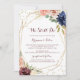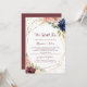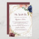 Cette parties scintillant d'or géométrique que nous faisons encore vow invitation de renouvellement est parfait pour une cérémonie de renouvellement de vow moderne et de célébration. Le design se compose de l'aquarelle dessinée à la main violet, marine, rousse, bordeaux, fleurs marines, parties scintillant feuille verte et dorée sur un cadre géométrique élégant.