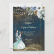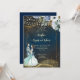 Parties scintillant en or bleu marine réception invitation modèle instantané téléchargement. Couple dansant, fleurs bleues poussiéreuses, lumières féeriques.