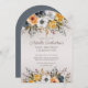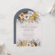 Invitation de 100e anniversaire en forme d'arc pour elle avec de belles fleurs d'aquarelle bleu et moutarde bleu marine et poussiéreux. Contactez-moi pour obtenir de l'aide sur vos personnalisations ou pour demander la correspondance ou la coordination des produits Zazzle.