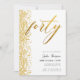 Un modèle d'invitation à la fête du 40e anniversaire blanc et or, glam, moderne, élégant et chic avec le mot "quarante" recouvert de feuille d'or (c'est un effet numérique), script de calligraphie moderne et typographie dans une teinte d'or, ainsi qu'un motif géométrique inspiré de la parties scintillant : points dorés et roses. Un design chic et intemporel pour une femme à son quarantième anniversaire.