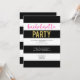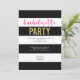 Cette invitation à la bachelorette moderne et amusante présente un arrière - plan rayé noir et blanc avec un texte cursif rose chaud et un texte de parties scintillant faux.