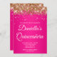 Créez votre propre invitation de célébration du 15e anniversaire pour votre fille. Des graphiques décoratifs en parties scintillant or brillant forment une bordure supérieure. L'art numérique arrière - plan présente un dégradé rose chaud de gomme à bulles très frappant. Customisez la couleur de texte ou les styles de police blancs de l'invitation. Le texte "Quinceañera" est également personnalisable. Les scintillants de luxe et la parties scintillant seront créés avec des éléments artistiques qui s'impriment comme une photo.